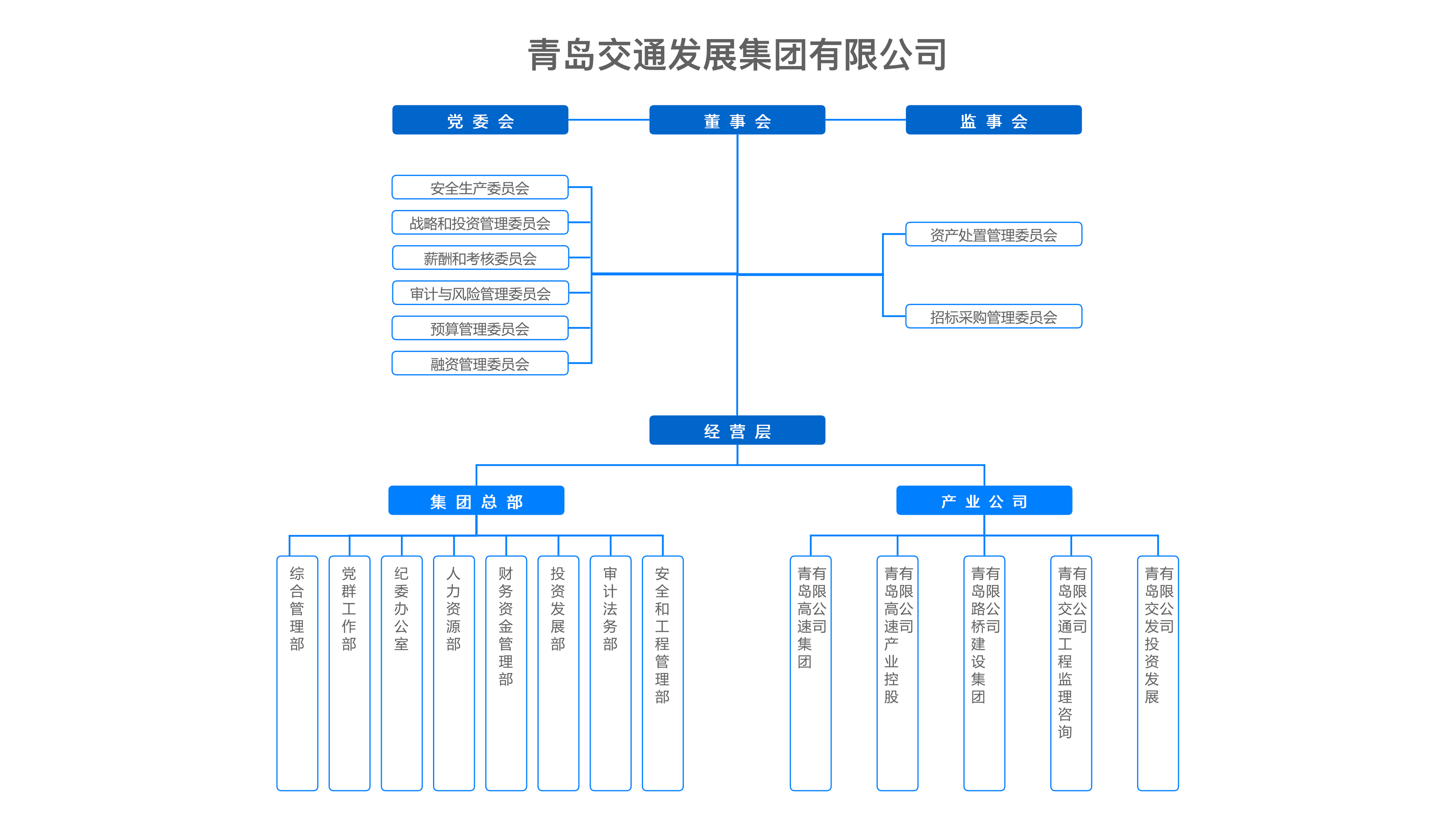 青島交通發(fā)展集團有限公司(以下簡稱“交發(fā)集團”)成立2012年5月,注冊資本10億元,定位為青島市交通建設(shè)投融資主體,負(fù)責(zé)所轄高速公路等交通基礎(chǔ)設(shè)施的運營、養(yǎng)護、管理工作和投融資建設(shè)任務(wù),承擔(dān)青島市未來高速公路發(fā)展和交通基礎(chǔ)設(shè)施建設(shè)投融資等職能?,F(xiàn)有所屬二級企業(yè)18戶,干部職工2100余人。